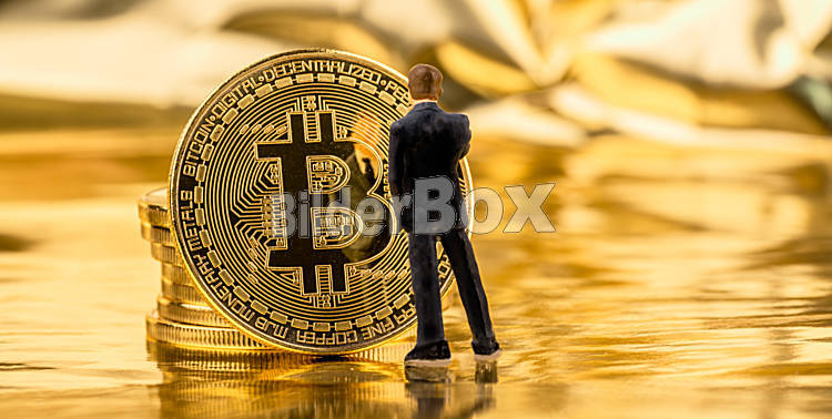 Beschreibung Physische Bitcoin Münze. Symbolfoto für digitale und virtuelle Währung