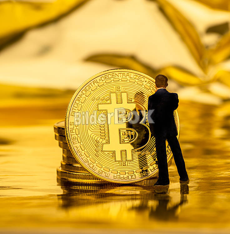 Beschreibung Physische Bitcoin Münze. Symbolfoto für digitale und virtuelle Währung