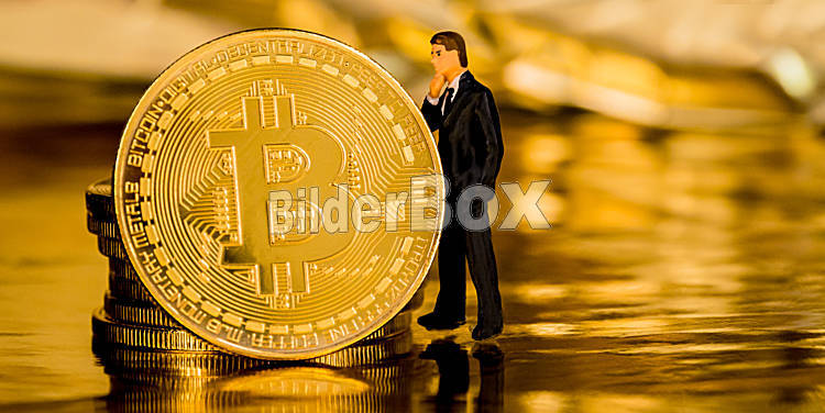 Beschreibung Physische Bitcoin Münze. Symbolfoto für digitale und virtuelle Währung