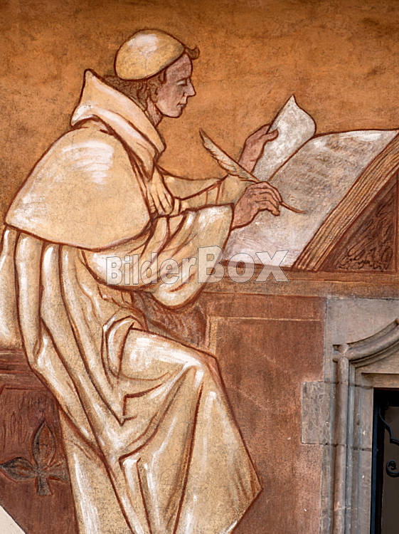 Beschreibung Prag, Tschechien. Malerei eines Mönches auf einer Hausfassade