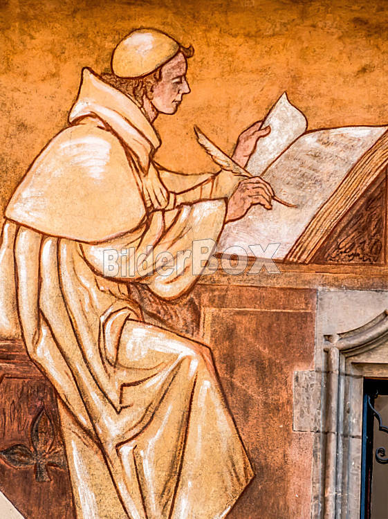 Beschreibung Malerei eines Studenten auf einem Gebäude in Prag, Tschechien.