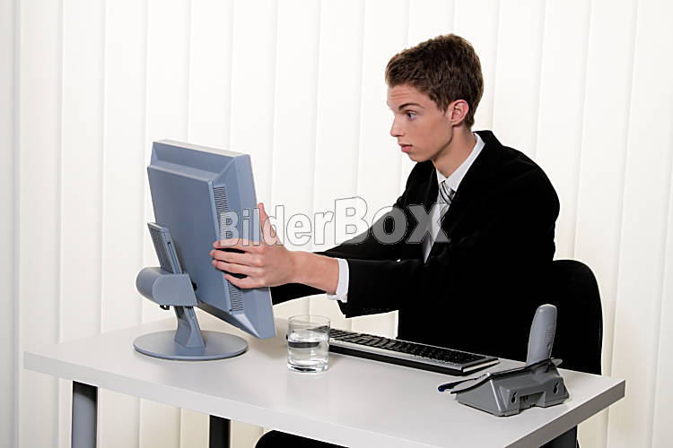 Beschreibung Ein Mann hat Probleme mit Computer Virus und Spam im Büro
