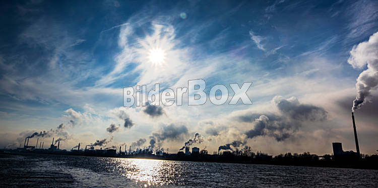 Beschreibung Rauchende Schlote auf einem Industriegelände. Symbolbild Umwelt