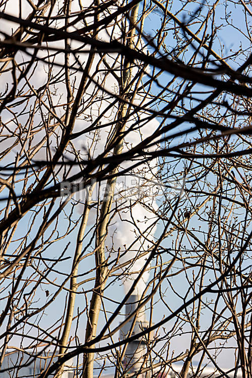 Beschreibung Aus einem rauchenden Schlote qualmt weißer Smog