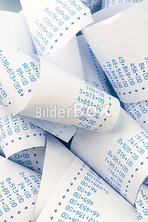 Beschreibung Die Streifen eines Taschenrechners. Symbolfoto für Kosten, Planung, Kalkulation, Gewinn und Umsatz