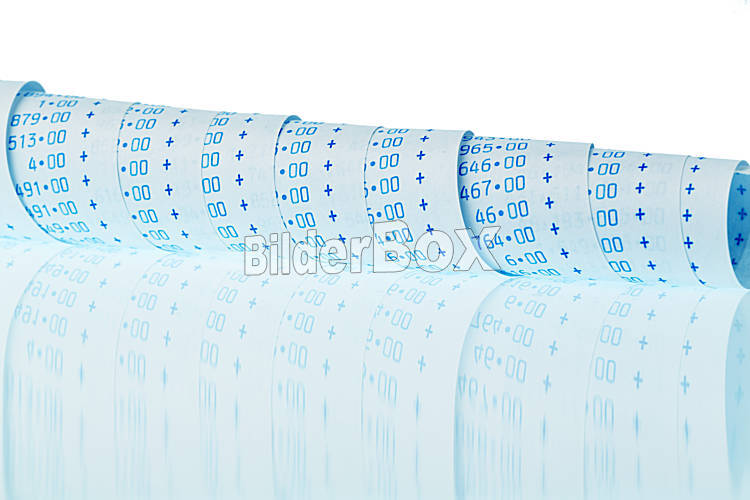 Beschreibung Der Rechenstreifen eines Taschenrechners auf weißem Hintergrund. Symbolfoto für Controlling, Buchhaltung, Steuern und Finanzen