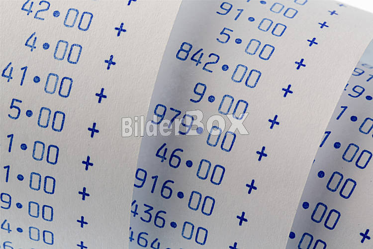 Beschreibung Der Rechenstreifen eines Taschenrechners auf weißem Hintergrund. Symbolfoto für Controlling, Buchhaltung, Steuern und Finanzen