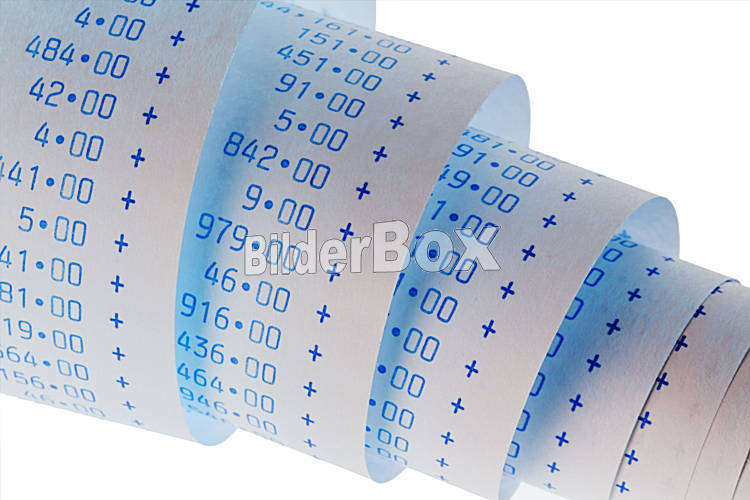 Beschreibung Der Rechenstreifen eines Taschenrechners auf weißem Hintergrund. Symbolfoto für Controlling, Buchhaltung, Steuern und Finanzen