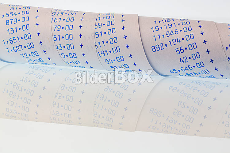 Beschreibung Der Rechenstreifen eines Taschenrechners auf weißem Hintergrund. Symbolfoto für Controlling, Buchhaltung, Steuern und Finanzen