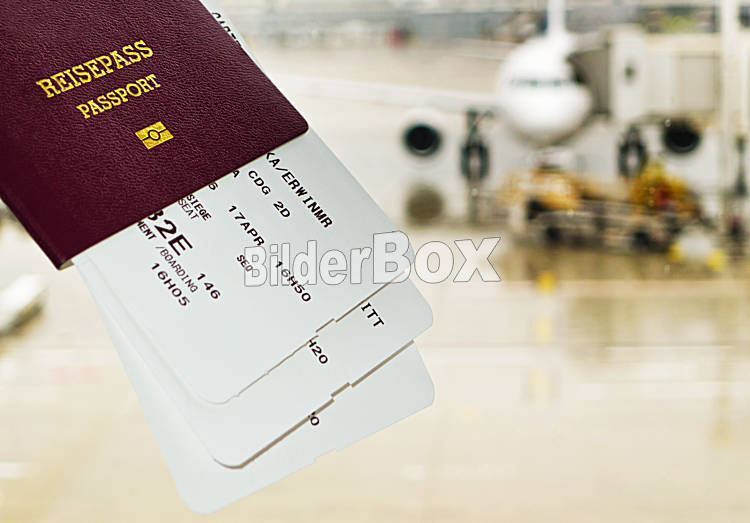 Beschreibung Ein reisepass und die Bordkarte für das Flugzeug auf einem Flughafen.