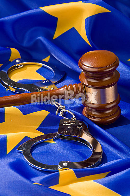 Beschreibung Richterhammer und EU-Fahne [ (c) www.BilderBox.com, Erwin Wodicka, Siedlerzeile 3, A-4062 Thening, Tel. + 43 676 5103678.Verwendung nur gegen HONORAR, BELEG, URHEBERVERMERK nach AGBs auf...
