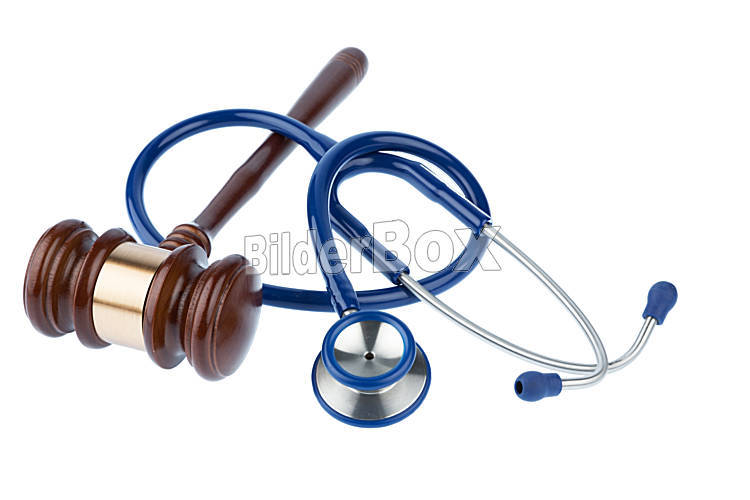 Beschreibung Richterhammer und Stethoskop, Symbolfoto für Pfusch und Ärztefehler