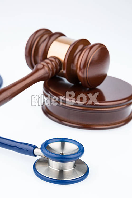 Beschreibung Richterhammer und Stethoskop, Symbolfoto für Pfusch und Ärztefehler