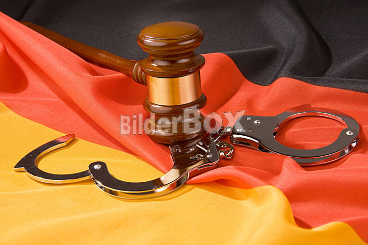 Beschreibung Richterhammer und deutsche Flagge [ (c) www.BilderBox.com, Erwin Wodicka, Siedlerzeile 3, A-4062 Thening, Tel. + 43 676 5103678.Verwendung nur gegen HONORAR, BELEG, URHEBERVERMERK nach AGBs auf...