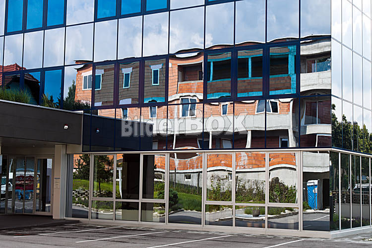 Rohbau eines Wohnhauses spiegelt sich in Fassade