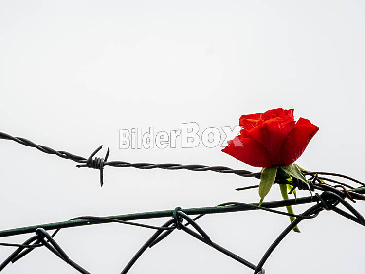 Beschreibung Eine Rose steckt im Stacheldraht. Symbolfoto für Trennung, Liebe, Abschiebung.