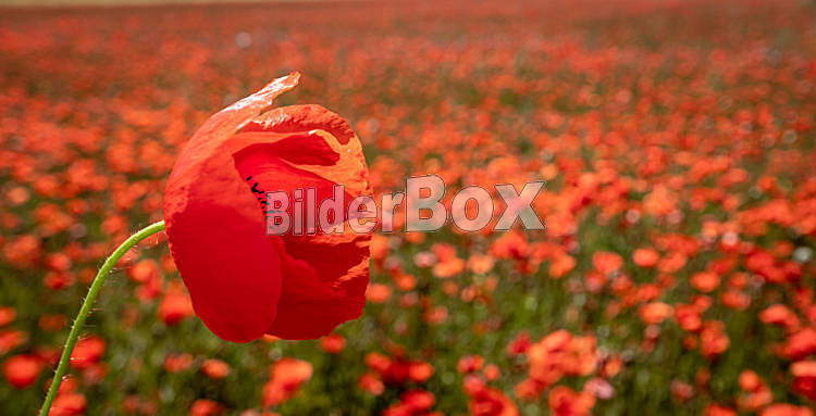 Beschreibung Eine rote Mohnblüte auf einem Mohnblumen Feld