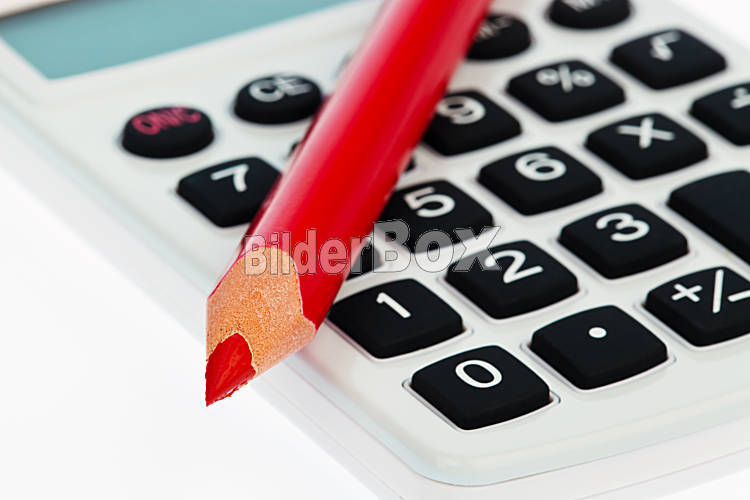 Beschreibung Ein Rotstift und ein Taschenrechner. Symbolbild Rationalisieren und einsparen