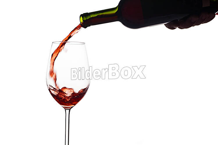 Beschreibung In ein Glas wird schwungvoll roter Wein eingeleert. Rotwein im Rotweinglas