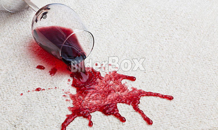 Beschreibung Ein umgefallenes Glas mit Rotwein verschmutzt einen Teppichboden.