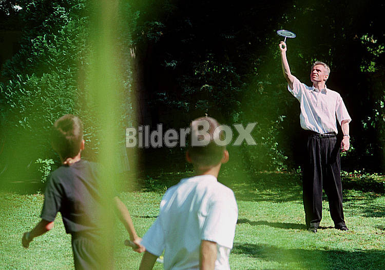 Beschreibung Mann mit Kindern beim Badminton / Federball spielen Menschen, Mann, Männer, Maenner, Erwachsener, Personen, Vaterschaften, Vaterschaftspflichten, Vater, Familienoberhaupt, Menschenkinder,...