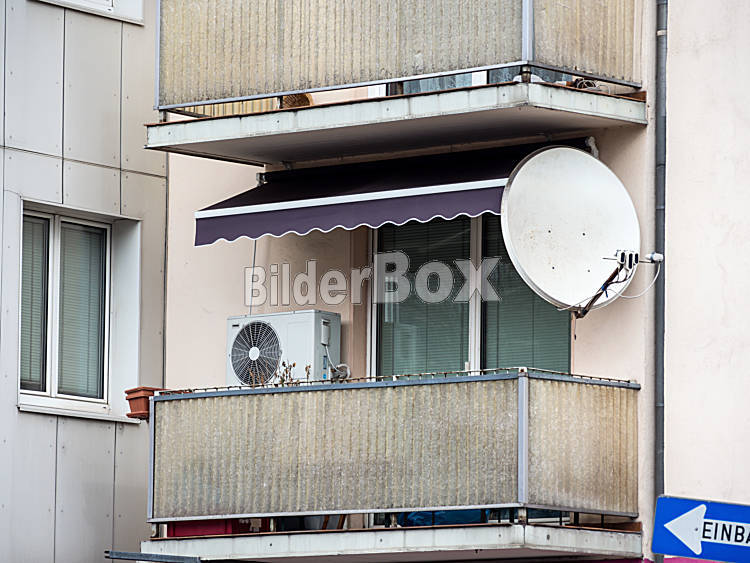 Beschreibung Auf einem Wohnhaus sind Satellitenanlagen für den TV Empfang montiert.