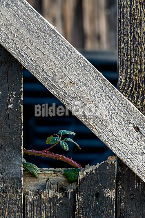 Beschreibung Schößling und alter Bretterzaun, Symbol für Leben, Wachstum, Neubeginn, Kraft, Hoffnung