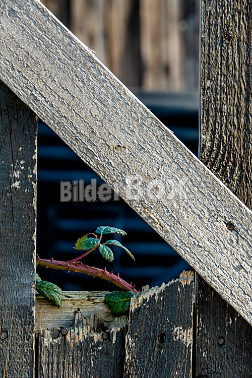 Beschreibung Schößling und alter Bretterzaun, Symbol für Leben, Wachstum, Neubeginn, Kraft, Hoffnung