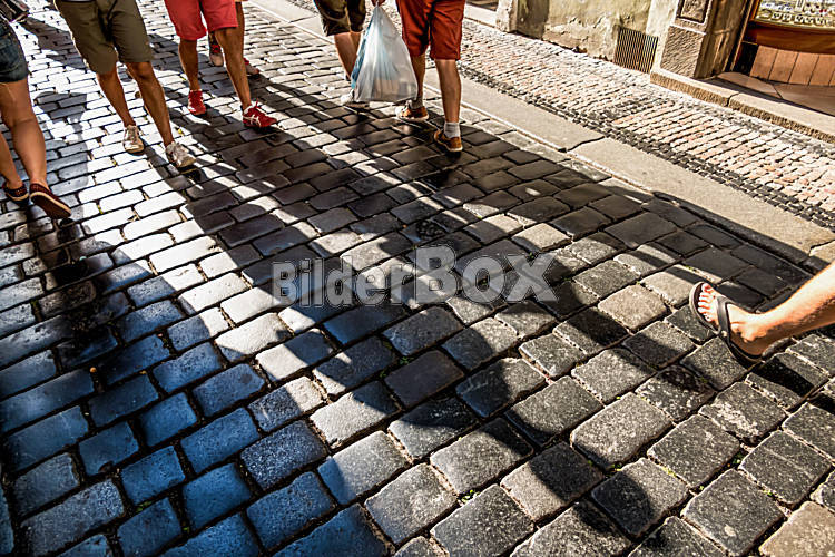 Beschreibung Schatten von menschen auf einem Straßenpflaster