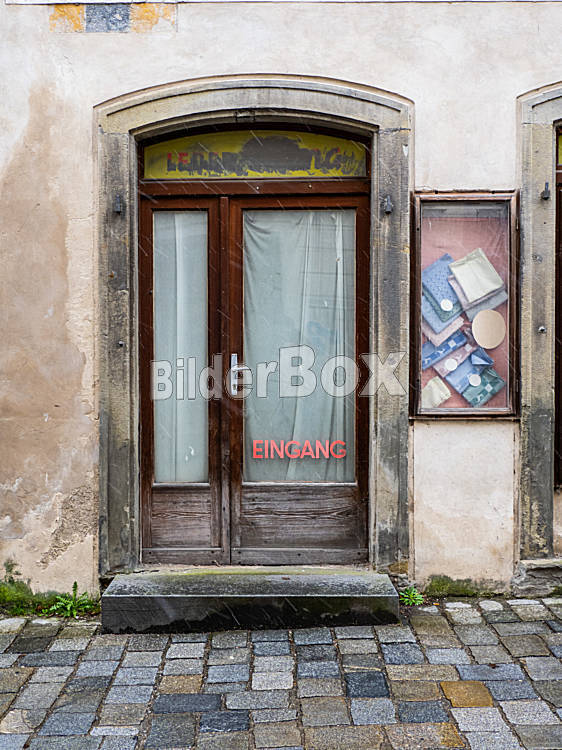 Beschreibung Schaufenster eines alten, aufgelassenen Ladens
