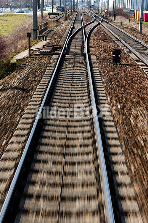 Beschreibung Österreich, Oberösterreich, Linz, Wels . Schienen einer Eisenbahn von einem fahrenden Zug zwischen Linz und Wels aus gesehen