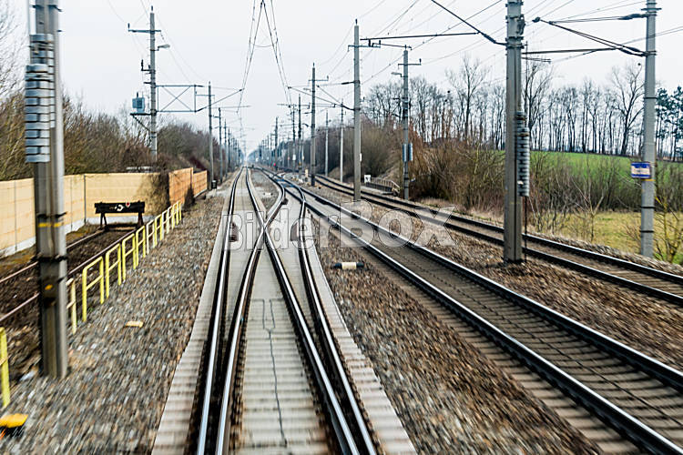 Beschreibung Österreich, Oberösterreich, Linz, Wels . Schienen einer Eisenbahn von einem fahrenden Zug zwischen Linz und Wels aus gesehen