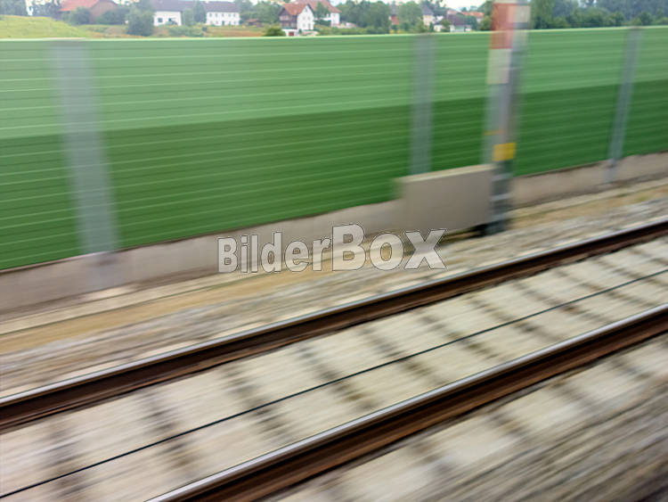 Beschreibung Gleise und Schienen in Bewegung aus einem fahrenden Zug heraus. Symbolfoto für Zugfahrt, Tempo und Dynamik.