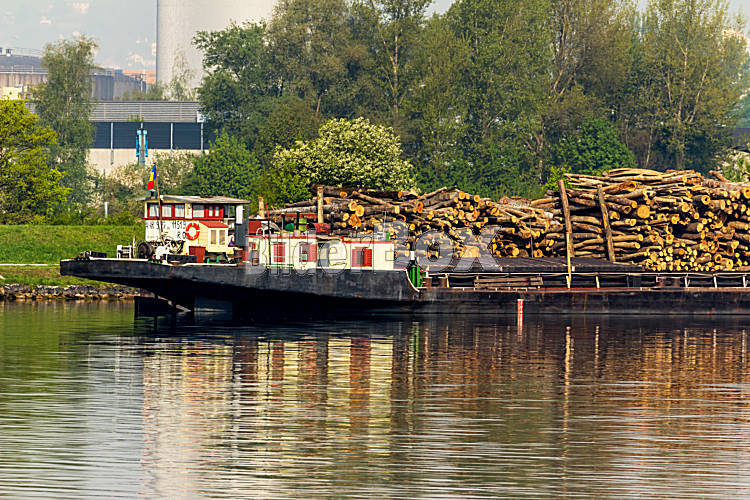 Beschreibung Ein Schiff auf der Donau in Österreich mit Holz beladen