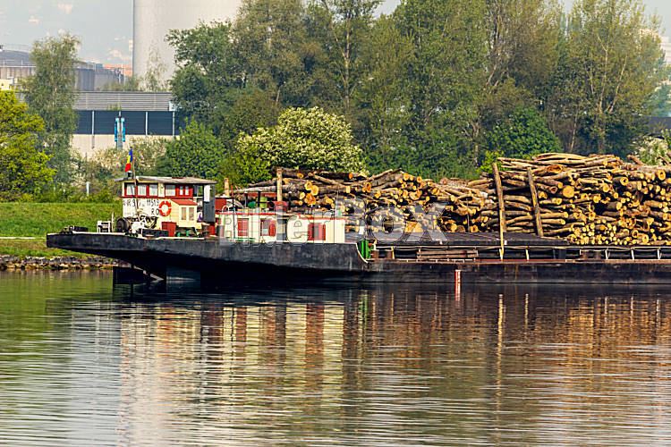 Beschreibung Ein Schiff auf der Donau in Österreich mit Holz beladen