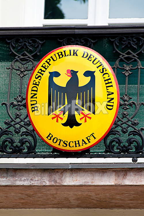 Beschreibung Das Schild einer deutschen Botschaft. Vertretung der Bürger im Ausland