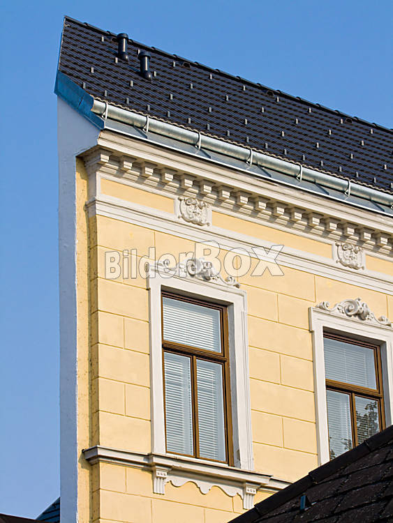 Beschreibung Sehr schmales Wohnhaus. Fassade eines renovierten Hauses.