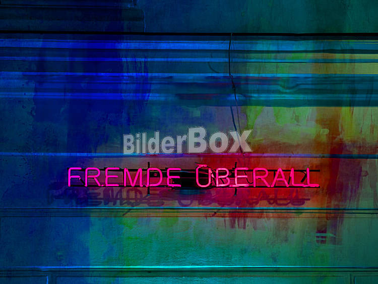 Beschreibung Schriftzug "Fremde überall" auf dem Museum der jüdischen Gemeinde in Wien. Bild farblich bearbeitet.