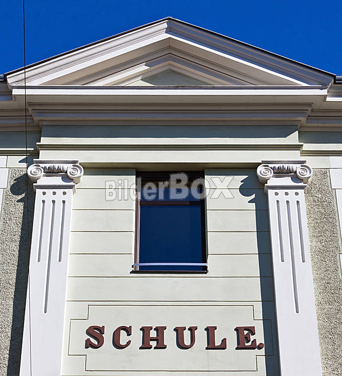 Beschreibung Fassade eines Schulgebäudes, Symbolfoto für Bildungswesen, Schulpflicht, Erziehung