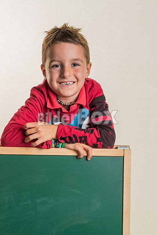 Beschreibung Ein Kind mit einer leeren Schultafel.
