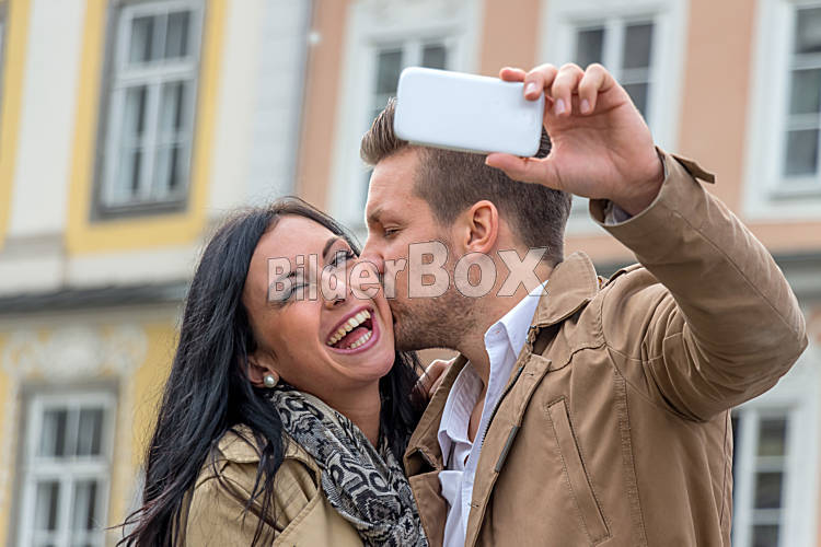 Beschreibung Ein junges Paar macht ein Selbstporträt mit einem Handy. Selfies sind in.