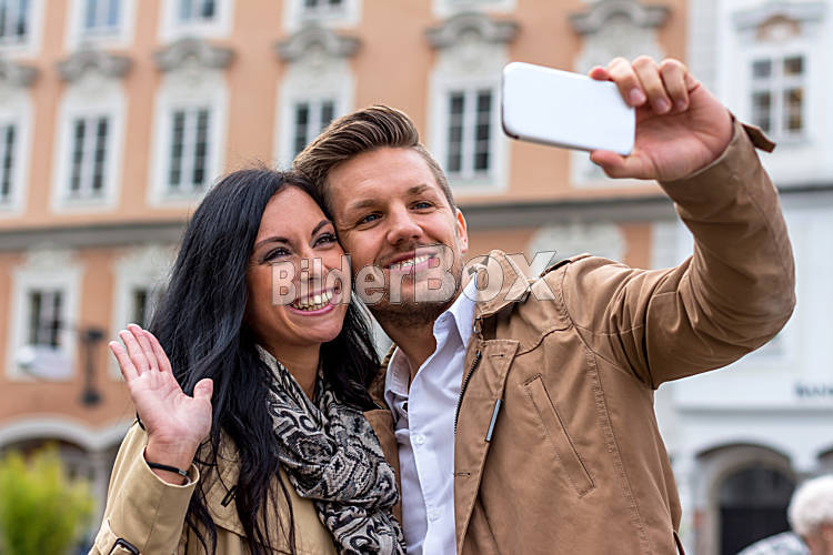 Beschreibung Ein junges Paar macht ein Selbstporträt mit einem Handy. Selfies sind in.