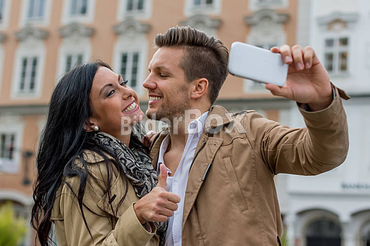 Beschreibung Ein junges Paar macht ein Selbstporträt mit einem Handy. Selfies sind in.