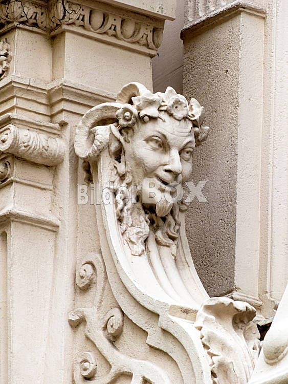 Beschreibung Skulpturen an der Fassade eines Altbaus in Wien