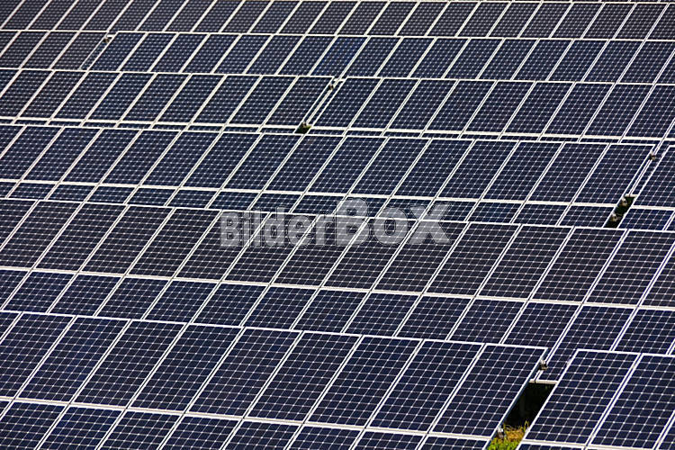 Beschreibung Solarzellen auf einem Solarfeld. Solar Kraftwerk für alternative Sonnenenergie.