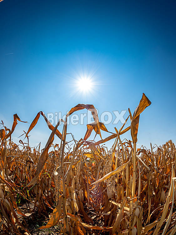 Beschreibung Schäden der Ernte bei einem Maisfeld durch Trockenheit und Dürre. Sonne brennt auf das Feld.