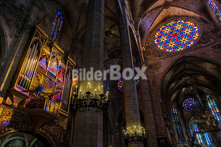 Beschreibung Spanien, Mallorca Kathedrale La Seu. Kathedrale der heiligen Maria. An wenigen Tagen im Jahr für einige Minuten fällt das Licht des Glasfensters genau auf die Orgel.