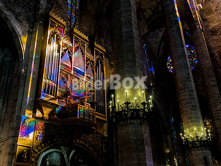 Beschreibung Spanien, Mallorca Kathedrale La Seu. Kathedrale der heiligen Maria. An wenigen Tagen im Jahr für einige Minuten fällt das Licht des Glasfensters genau auf die Orgel.
