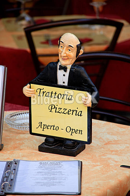 Beschreibung Stummer Diener einer Pizzeria mit Schild und Speisekarte