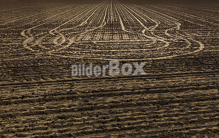 Beschreibung Auf einem Feld in der Landwirtschaft befinden sich Spuren von einem Traktor.